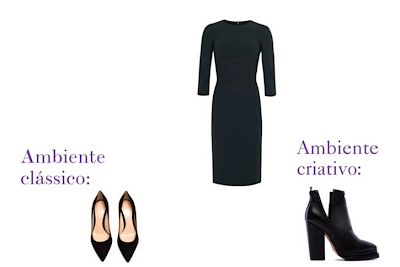 Um sheath dress de decote fechado q.b. (de manga 3/4 ou pelo punho) é uma escolha à prova de erro: feminino e elegante mas não demasiado delicado, favorece todas as silhuetas e sendo uma peça só, não vai desviar-lhe preciosa a concentração para pensar o que combina com o quê ou se a camisa amarrota e sai para fora das calças ou da saia. Também é menos "postiço" do que um fato - caso não esteja acostumada a usar um todas as semanas - e dependendo dos acessórios e do calçado, adapta-se a um dress code formal ou criativo. Preto é uma escolha segura, mas se lhe parece demasiado dramático opte por azul marinho. Ambos passam uma mensagem meaning business, chic mas sem dar a entender que perde tempo com futilidades.