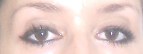 | O makeup (express!) ainda não estava finalizado, mas dá para terem uma ideia: um toque muito leve de sombra rosada e castanho café na "banana" e umas pinceladas rápidas dos dois tons de eyeliner . |