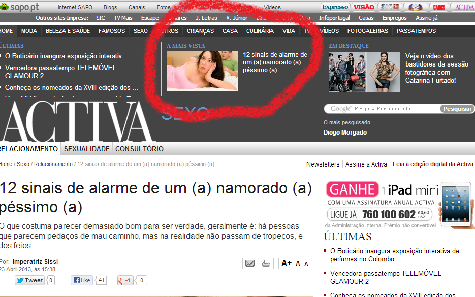 ...ao ver que um texto meu é o mais lido no portal da Revista Activa. On the other hand, o que a popularidade do post indica deixa-me apreensiva: ou há por aí muitos namorados e namoradas péssimas, ou muita gente já se escaldou e anda com medo de tropeçar num desses exemplares novamente, ou ouviu falar e tem medo. No que eu puder ajudar a prevenir a maleita, aqui me têm à disposição, que o que uma pessoa vai vendo, ouvindo e aprendendo tem de servir para alguma coisa...